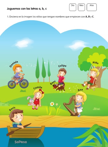 Día Mes Año Juguemos con las letras a, b, c 1. Encierra en la imagen los niños que tengan nombres que empiecen con A, B y C. Daniela Felipe Aldo Boni Camila Ana Boris 8 8 9 9