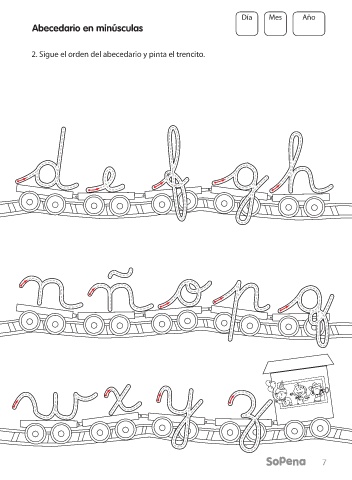 Día Mes Año Abecedario en minúsculas 2. Sigue el orden del abecedario y pinta el trencito. 6 7