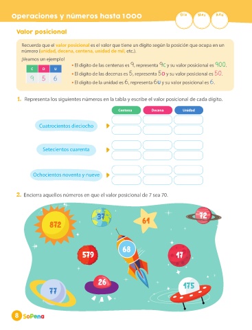 1. Representa los siguientes números en la tabla y escribe el valor posicional de cada dígito.